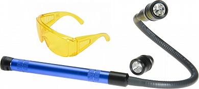 Набор для поиска утечки фреона: ультрафиолетовая лампа (RK1267) + очки со 100% защитой от ультрафиолетовых лучей (UV1002.01).FLEXIBLE BRIGHT TORCH -У/Ф лампа 5 led c двумя насадками и зондом, которая позволяет обнаружить утечки фреона даже в труднодоступных местах.